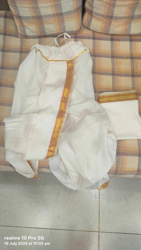This dhoti-dupatta set preserves the classic dhoti drape while offering a comfortable, wrinkle-resistant art silk structure that stays refined throughout the day. The ready-made design eliminates folding, tying, and pleating, making it ideal for weddings, rituals, festive gatherings, and traditional ceremonies.